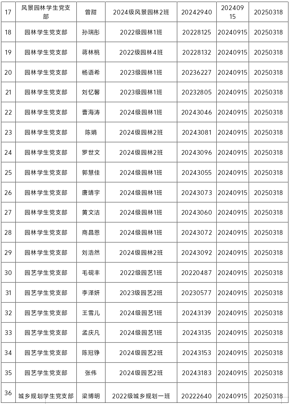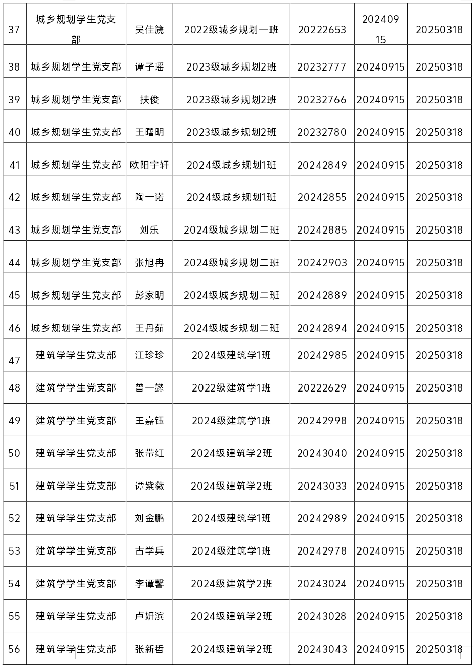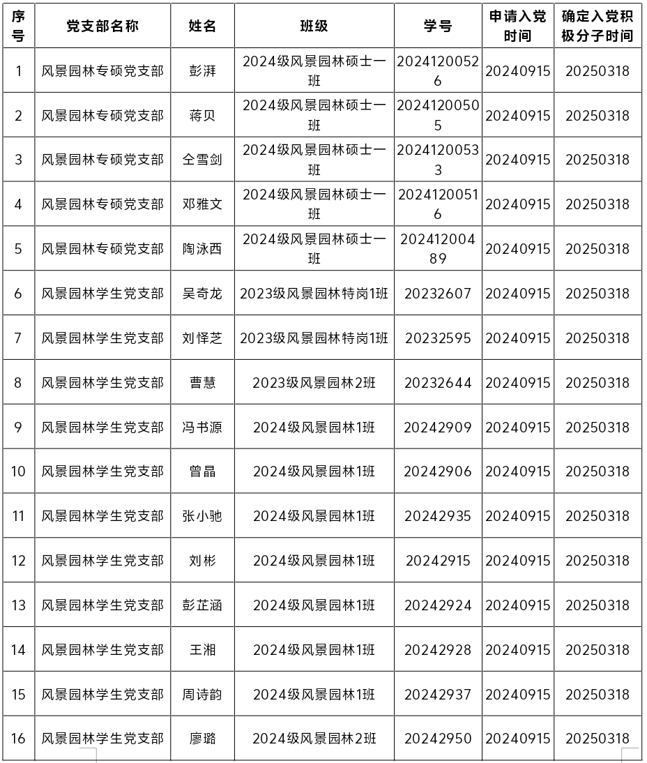 根据《中国共产党章程》、《中国共产党发展党员工作细则》及我校党员发展工作的相关规定,在听取党员和群众意见,综合团组织“推优”结果基础上,经中共中南林业科技大学风景园林学院委员会推荐、研究,拟确定彭湃等58名同志为入党积极分子,具体情况公示如下: