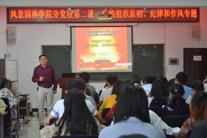 2019年10月19日上午9点,风景园林学院第63期入党积极分子培训第二课在至美楼二楼218教室成功开展。此次党课的授课人为班戈学院党委书记彭金波,他以《党的组织原则、纪律和作风》为主题为我们展开了讲解。