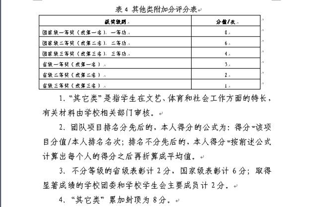 (2)附加分评分细则:1. 附加分中单个项目的计分办法详见“附加分评分细则”;2. 同一项目以最高分计入,不累计加分,不同类项目的得分可以累加;3.以学院为单位统一计算附加分。(后附学校评分细则文件截图,附加分相关材料自行至相关部门认证后于9月12日上午12:00前交至学生工作办公室阳俊坤老师处)