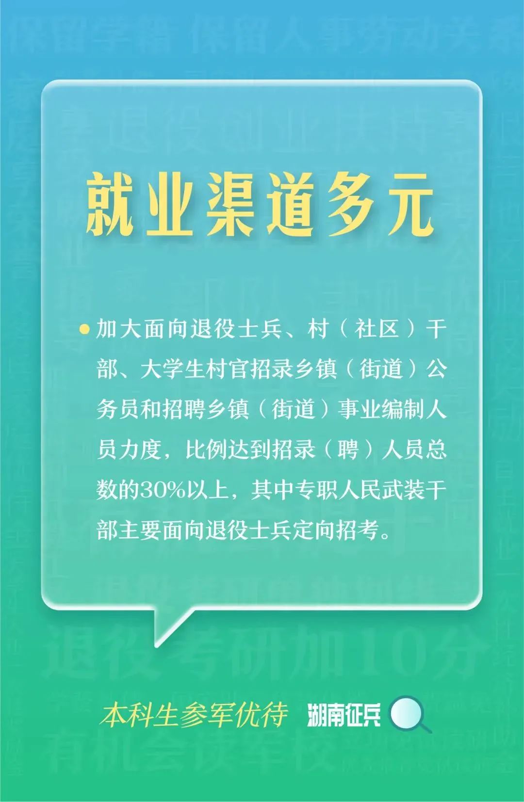 长沙市招录政法干警时,安排不低于总名额的20%面向退役士兵定向招录;国有、国有控股和国有资本占主导地位的企业新招职工时,安排不低于总名额的10%面向退役士兵定向招录。