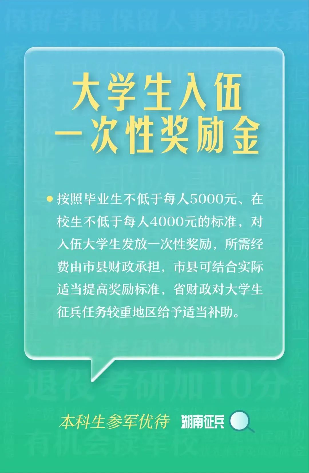 对从长沙市应征入伍的大学生,按15000元/人的标准发放一次性奖励金。