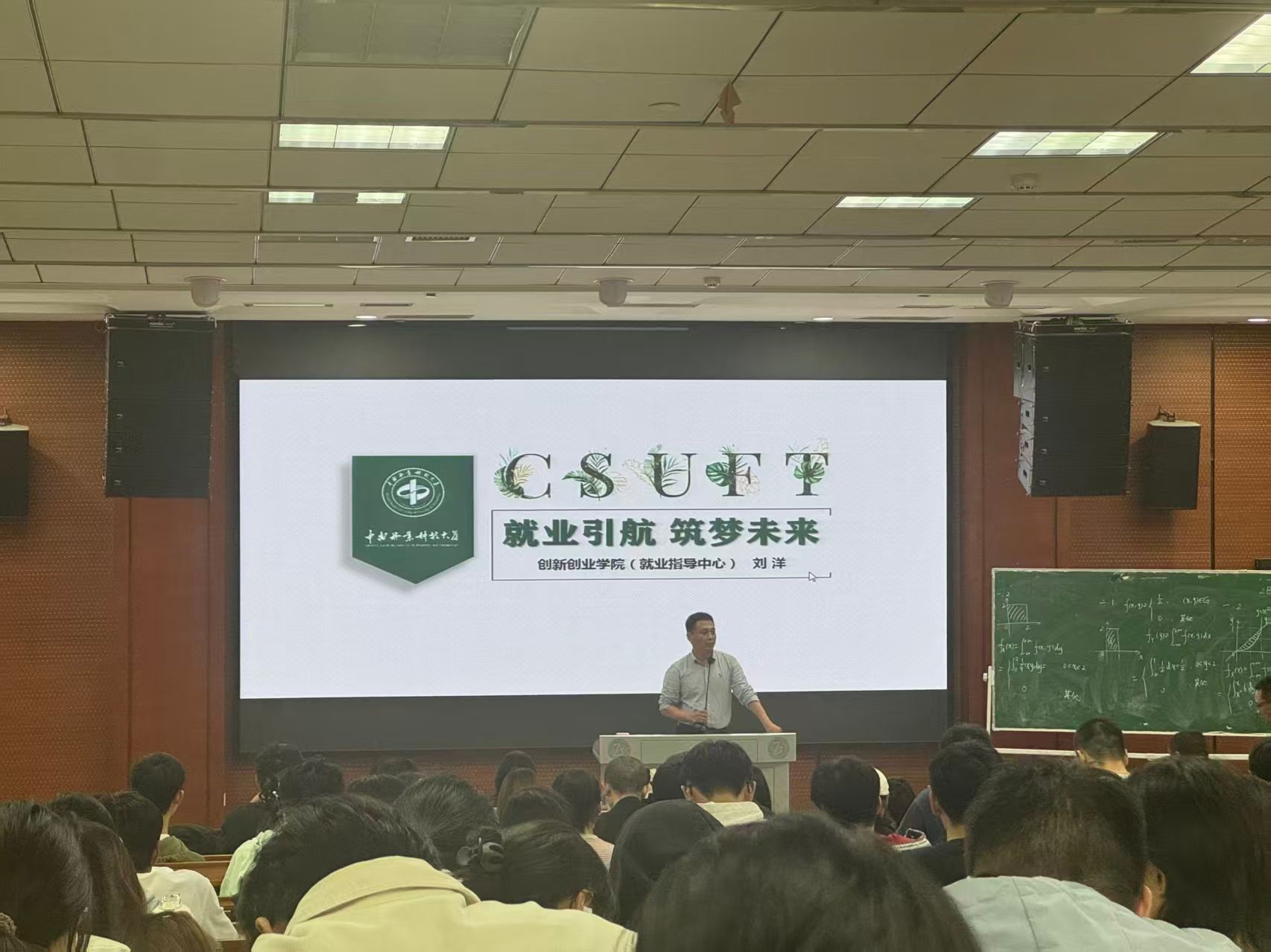 会上,刘洋以“关注形势、提前规划、精准择业”为主题,围绕宏观经济走势、行业用人需求、国家与地方最新就业政策作专题报告。他通过详实数据对比,为2026届毕业生提供了全面的就业指导与规划建议,鼓励同学们树立“先就业、再择业、敢创业”的理念,积极投身国家重点战略与地方基层项目。