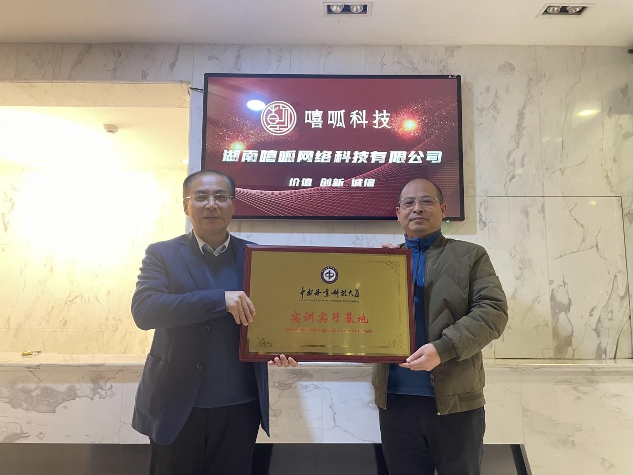 座谈会后,在双方与会人员共同见证下,中南林业科技大学副校长尹健代表校方,向湖南嘻呱网络科技有限公司授予“实训实习基地”牌匾,公司负责人汪海波代表企业接牌。