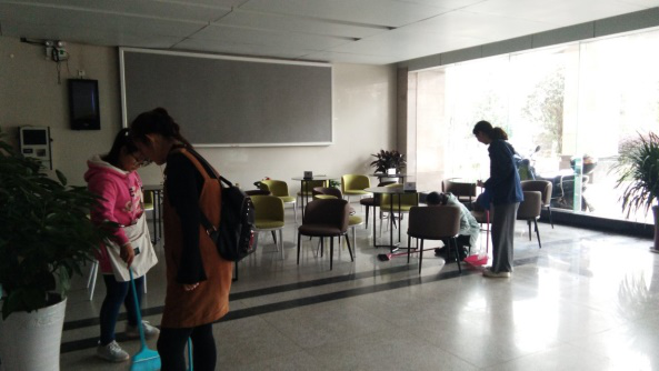 在本次“学雷锋”活动中,我院团委学生会全体对国际楼楼道、教室等地点进行清扫。从一楼到六楼,从东侧到西侧,对所负责区域都尽职尽责,不遗漏任何一个死角。只为给老师提供一个干净的教学场地,给同学们提供一个舒适的学习场所。