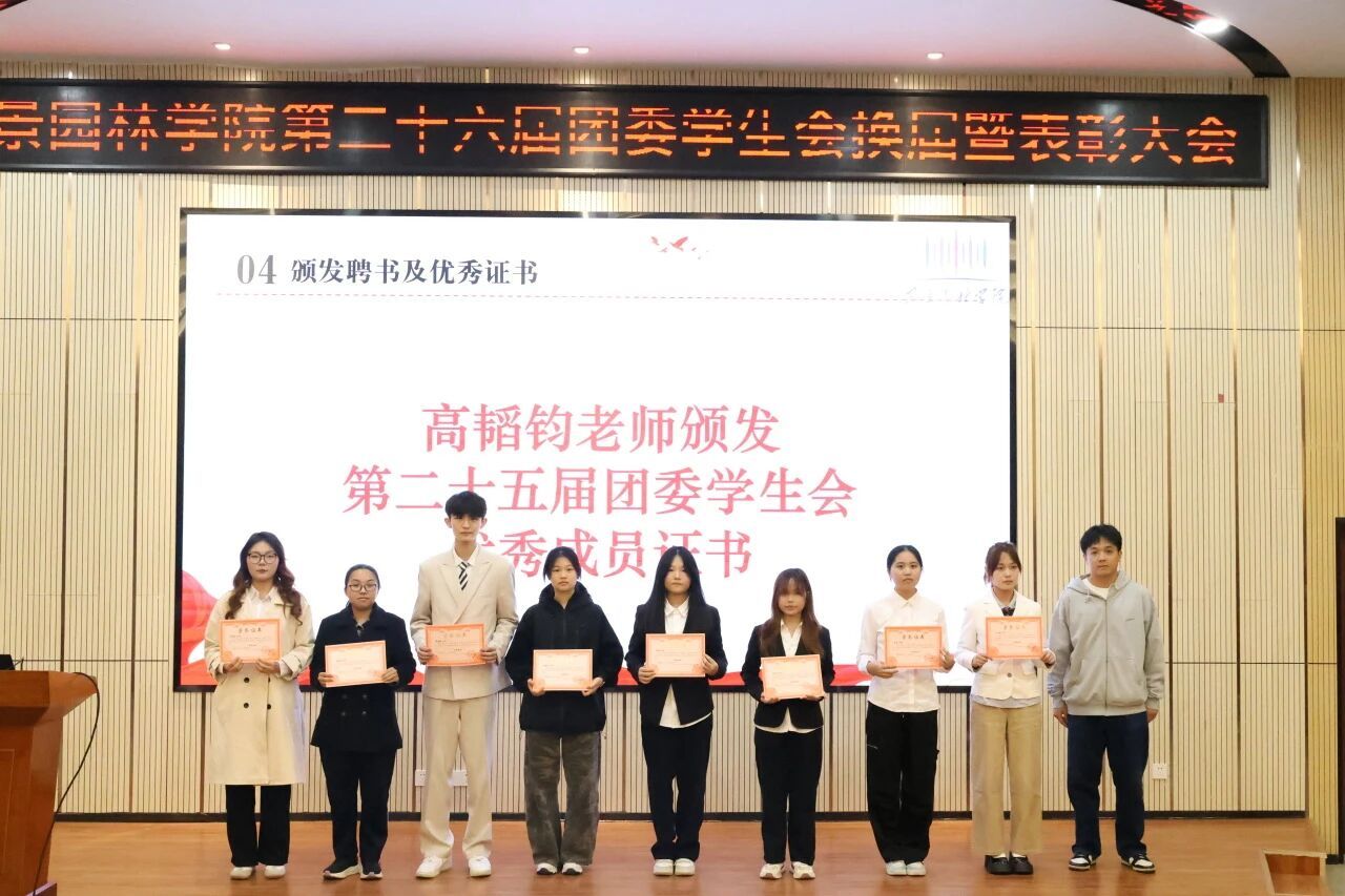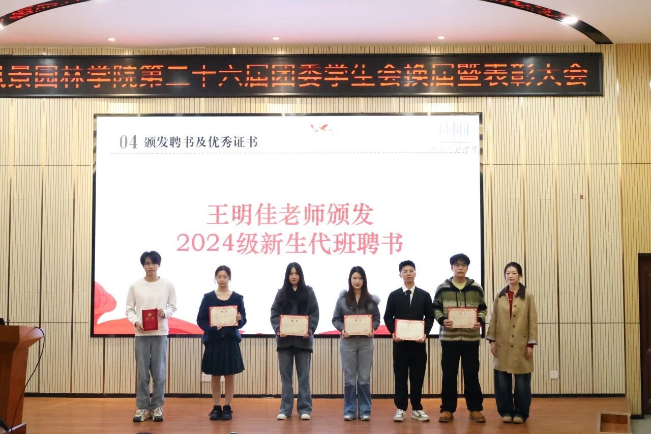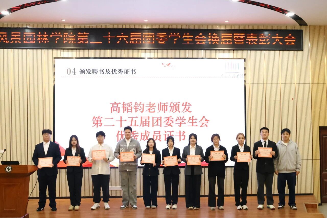 风景园林学院第二十六届团委学生会换届暨表彰大会于2025年10月26日19:00在东园林学院报告厅举行。出席本次会议的有:风景园林学院党委副书记王頔老师,辅导员王明佳老师,辅导员、团委书记高韬钧老师。本次会议由冯书源主持。