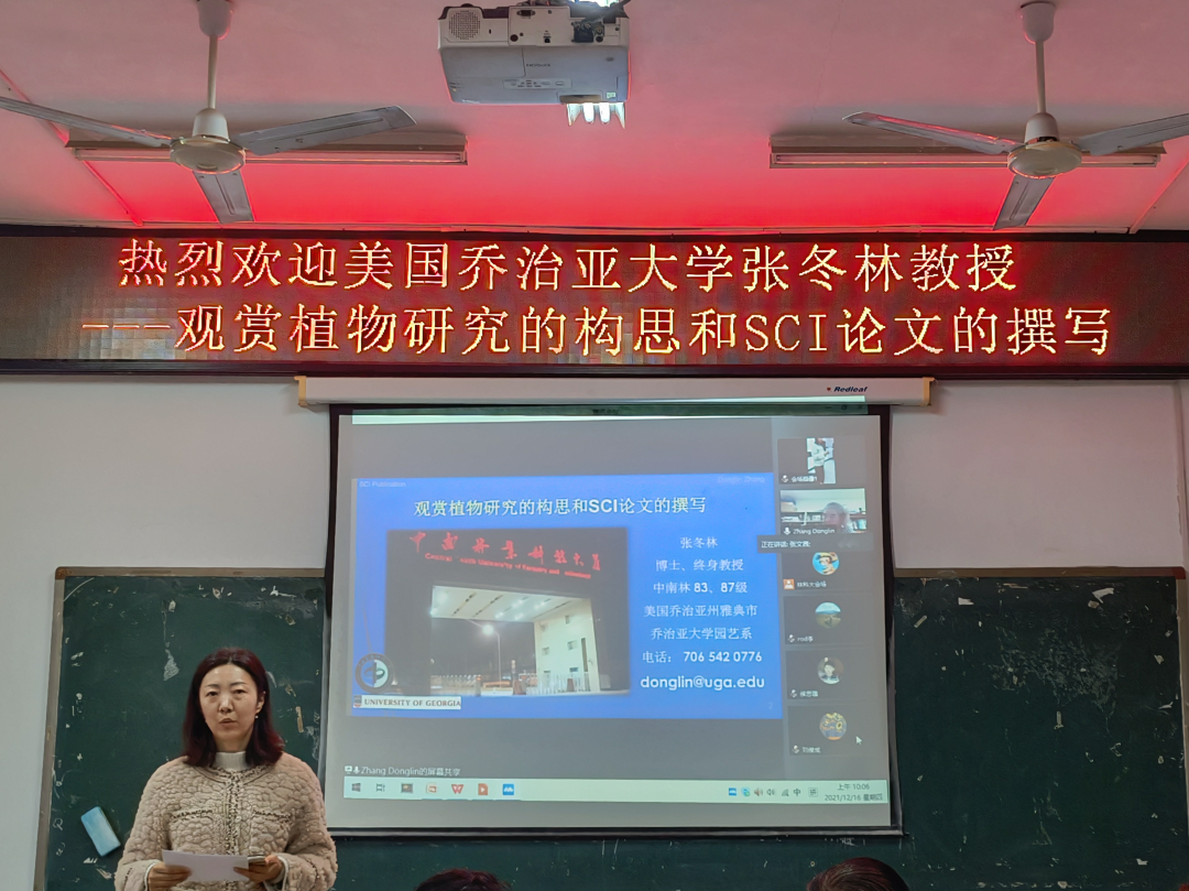 12月16日上午10:00,中南林业科技大学特聘教授,美国乔治亚大学资深教授张冬林教授为我院师生作了题为“观赏植物研究的构思和SCI论文的撰写”的线上学术讲座,线下会场为至美楼研究生教室。
