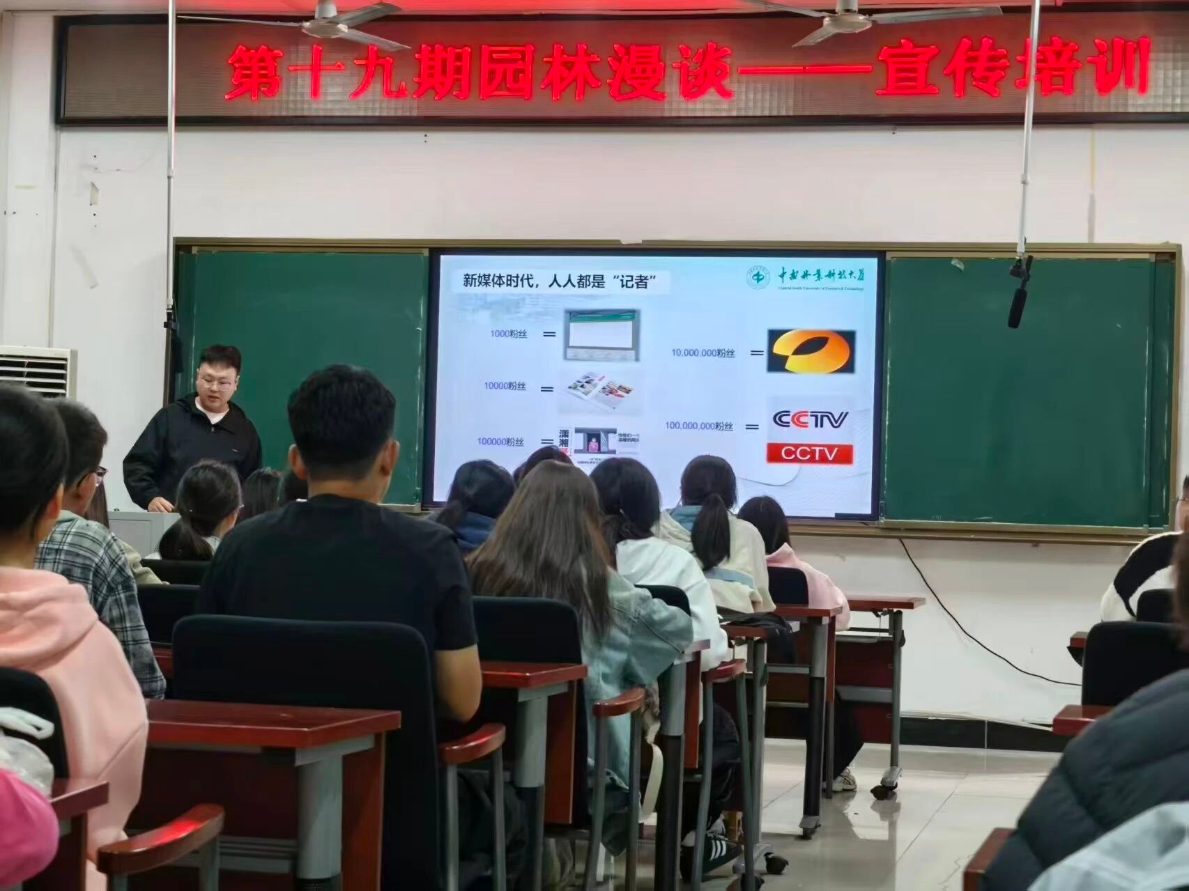 10月24日晚,风景园林学院在至美楼218教室举办了第十九期园林漫谈活动。本次活动以宣传培训为主题,由宣传统战部王天宏老师担任主讲,参加本次活动的有辅导员高韬钧老师、学院团委宣传部全体成员以及众多对宣传工作感兴趣的同学。