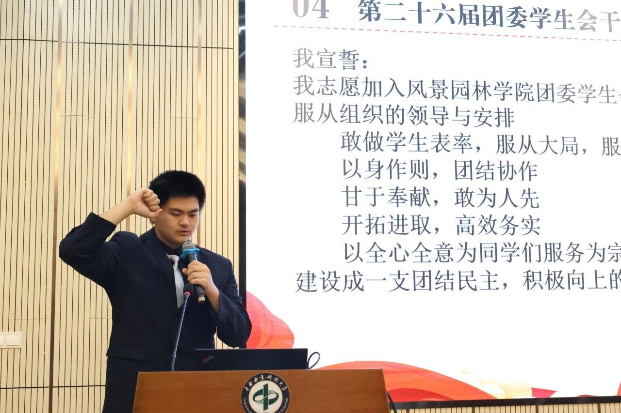 执行主席王曙明带领第二十六届团委学生会干部进行就职宣誓。学生会干部们高举右手,庄严宣誓,誓言铿锵有力,彰显出他们的使命担当。