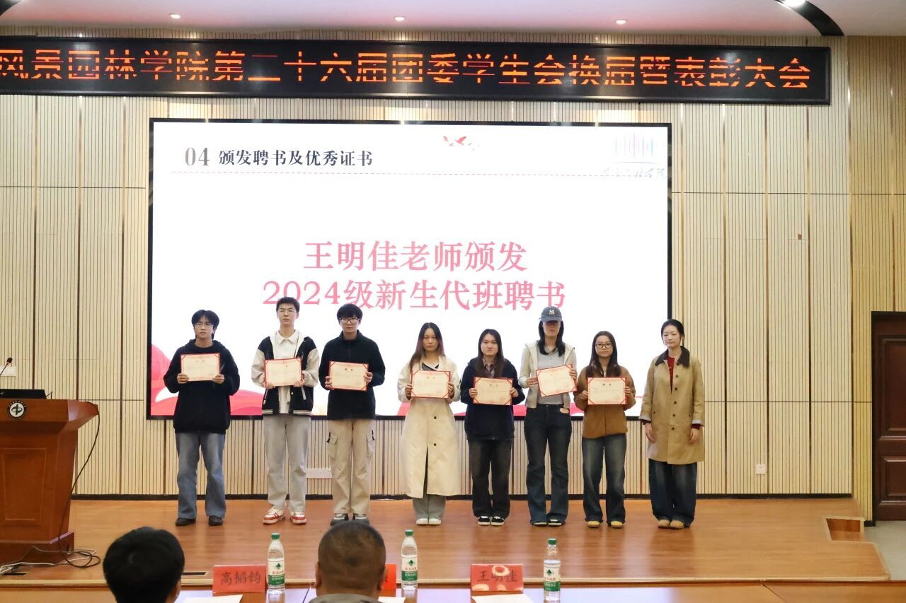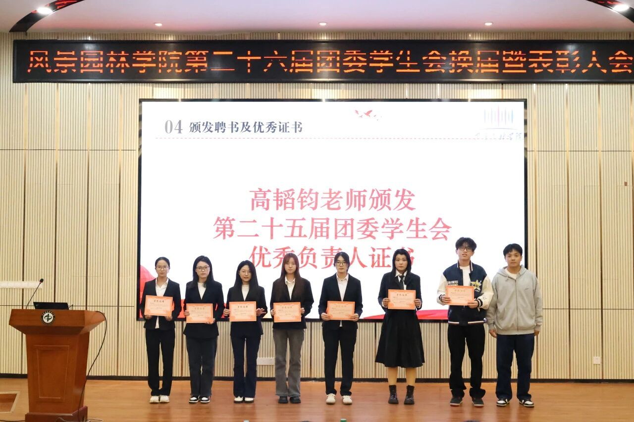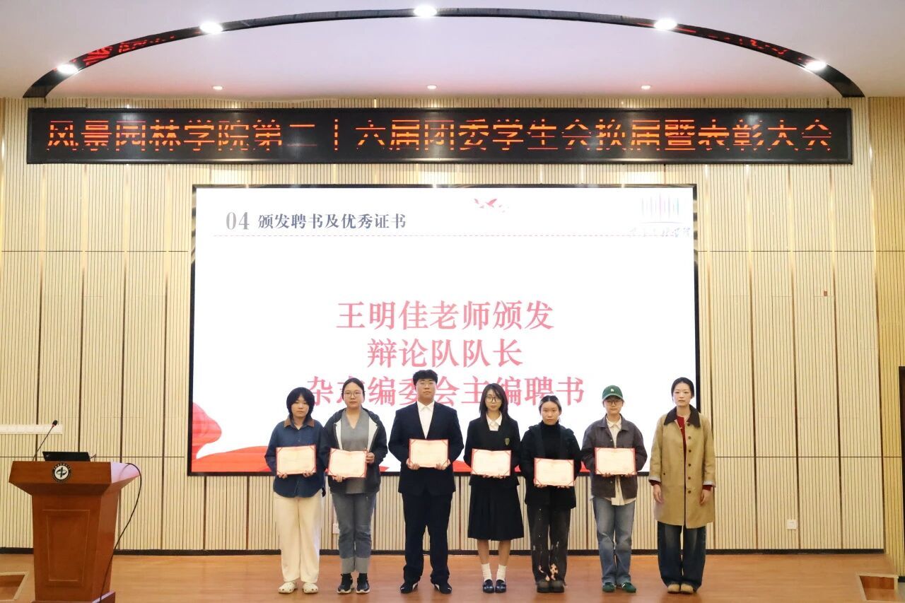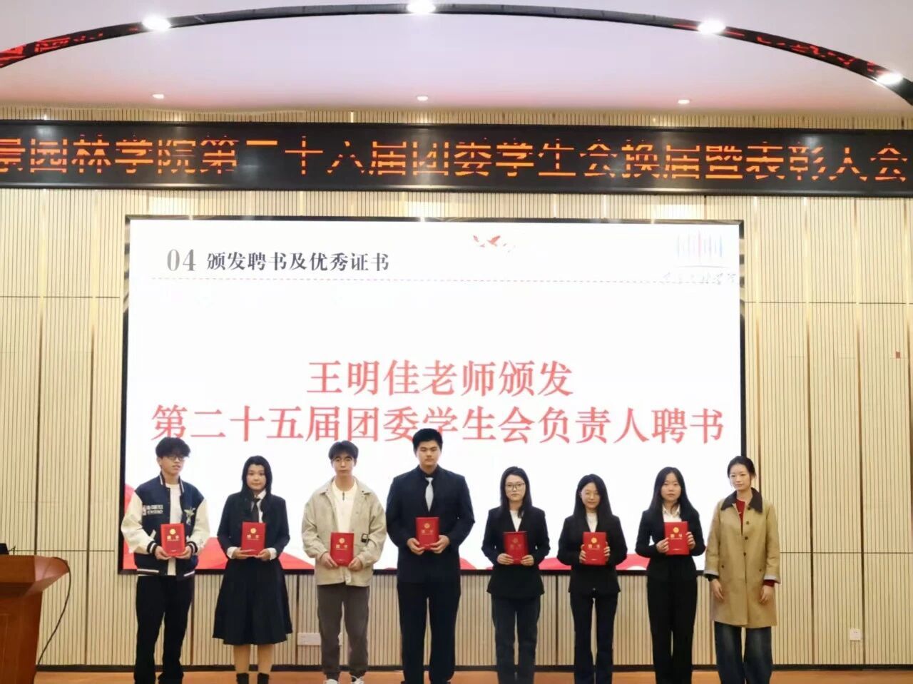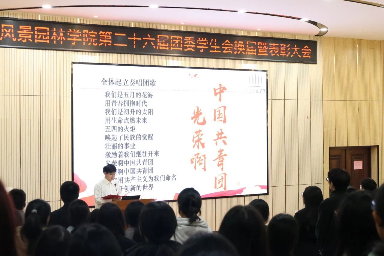 风景园林学院第二十六届团委学生会换届暨表彰大会于2025年10月26日19:00在东园林学院报告厅举行。出席本次会议的有:风景园林学院党委副书记王頔老师,辅导员王明佳老师,辅导员、团委书记高韬钧老师。本次会议由冯书源主持。