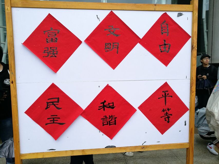 最后,由学生代表题写“富强、文明、自由、民主、和谐、平等”书法作品,体现了社会主义核心价值观,工作人员将这些作品粘贴在展板上进行展示。学院党委副书记、学工办全体成员、全体党员、预备党员、全体班干部以及各班代表在横幅上签字。