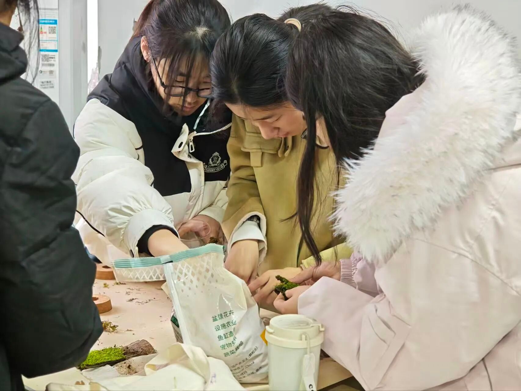 第二步:种植生命,植入“心绿”,随后,大家用镊子小心翼翼地植入网纹草、袖珍椰子、苔藓等植物,每一株植物的选择、定位与搭配,都是内心表达的延伸。
