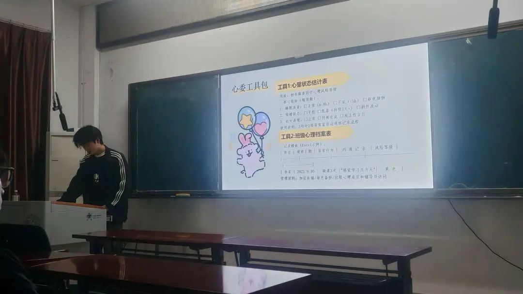 其次,主持人通过几个具体的案例分析,并提出了行动建议,从而引出了心理委员会遇到的常见问题,然后给心理委员规划了职业目标,明确心委要学会丰富自我、初步沟通、记录信息、上报导员。