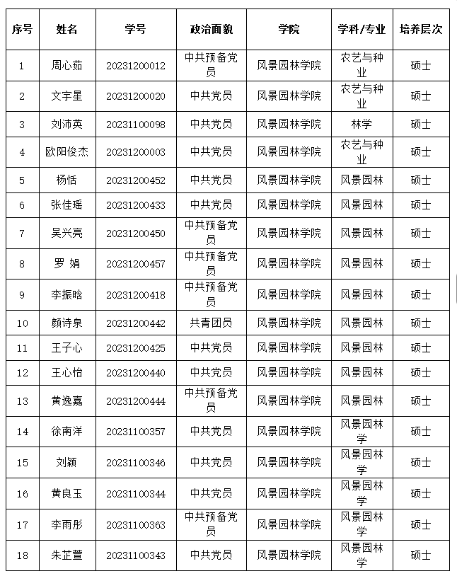 根据《关于评选中南林业科技大学2026届优秀毕业研究生的通知》,经个人申请、班级提名、学院评议讨论通过,拟推荐周心茹等18名同学参评中南林业科技大学2026届优秀毕业研究生,公示期为2026年3月13日至2026年3月17日,如对此结果有异议,请在公示期内,个人实名提交书面异议报告到至美楼308办公室,其他方式及逾期不子处理,联系人:辅导员王明佳,联系电话:0731-85623022。公示如下: