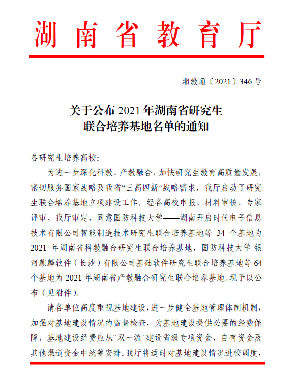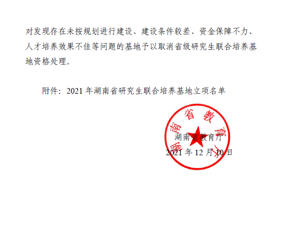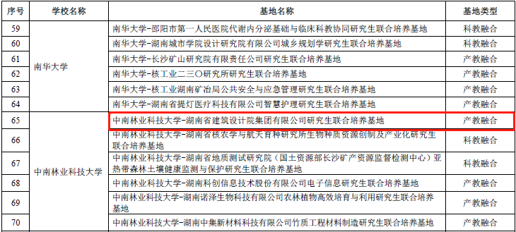 12月13日,湖南省教育厅公布了2021年湖南省产教融合研究生联合培养基地名单,由我校风景园林学院牵头申报的中南林业科技大学-湖南省建筑设计院集团有限公司研究生联合培养基地名列其中。至此,学院已拥有湖南省研究生联合培养基地3个。