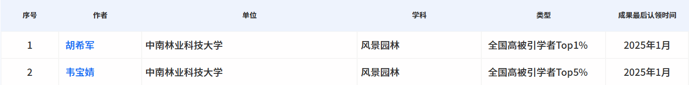喜报!我院胡希军教授和韦宝婧副教授连续两年入选中国知网风景园林学科全国高被引学者