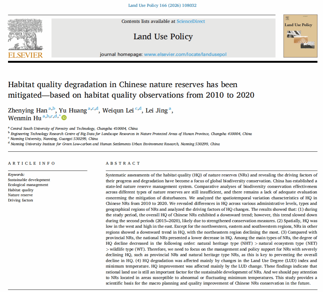 近日,我院胡文敏副教授团队在自然保护地生态系统服务功能评估领域取得新进展。相关成果以“Habitat quality degradation in Chinese nature reserves has been mitigated—based on habitat quality observations from 2010 to 2020”为题,发表于SSCI中科院一区期刊《Land Use Policy》(IF=5.9,Top1%)。该研究依托中南林业科技大学风景园林学院、湖南省自然保护地风景资源大数据工程技术研究中心。