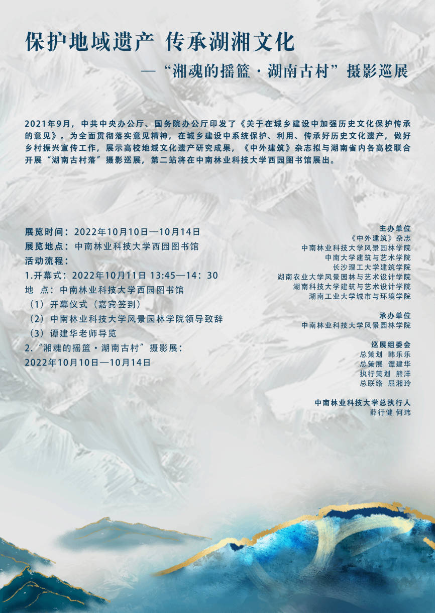 保护地域遗产,传承湖湘文化——“湘魂的摇篮,湖南古村”摄影巡展暨“地域文化遗产”系列研讨会即将开展,第二站开幕仪式与学术研讨会将于10月11日在中南林业科技大学西园图书馆召开。